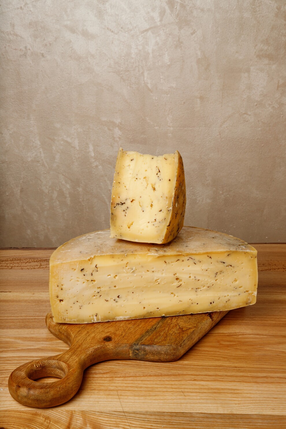 Сыр Гауда с трюфелем — это изысканное сочетание классической Гауды и глубокого насыщенного вкуса трюфеля. Вкус сыра богатый и сложный, с легкой сладостью и насыщенной умами-нотой, которая прекрасно раскрывается на фоне трюфелей.
