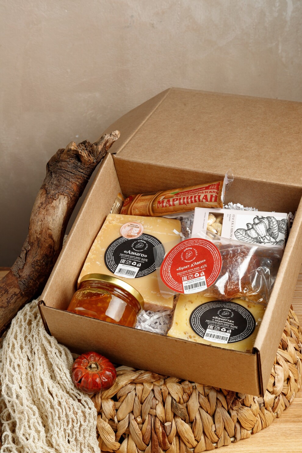Три сорта сыра в сочетании с шоколадом или марципаном и баночкой джема. Упаковано в крафтовую коробку.