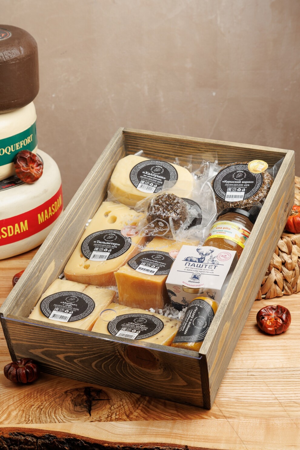 Восемь сортов вкусного и пикантного сыра от сыроварни Нойдам, паштет и фруктовая горчица. Подача в деревянном ящике